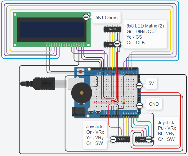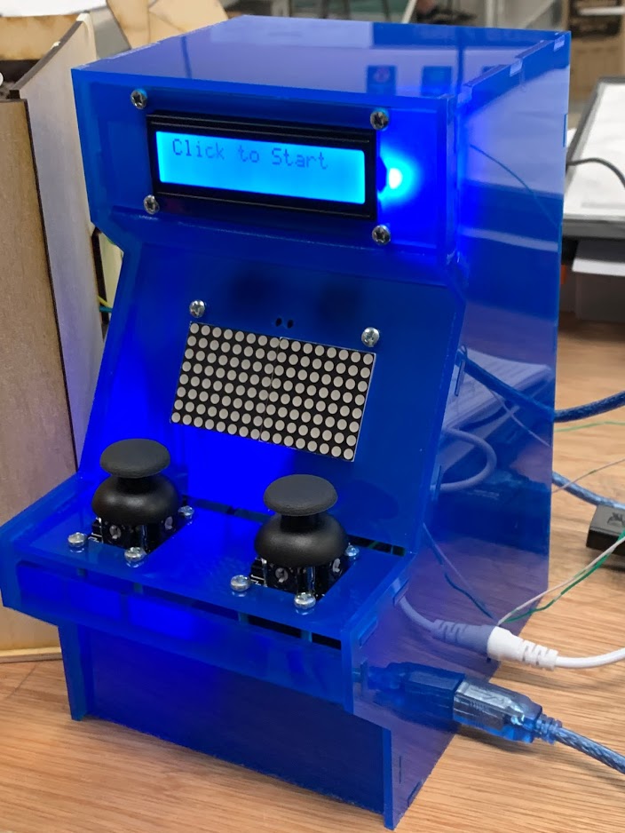 The housing was designed in AutoCAD and laser cut from acrylic. The electronics are all connected to an Arduino running a two-player version of Snake written in C++.