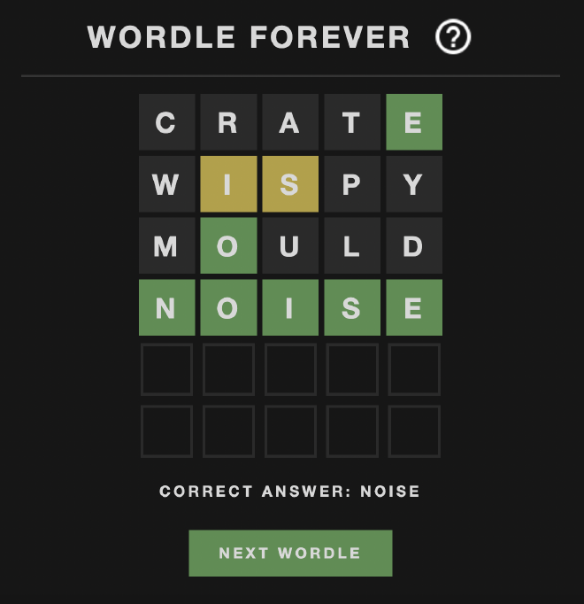 I wanted to play Wordle more than once per day however, so I made my own never-ending version with Vue. You can play Wordle Forever here.